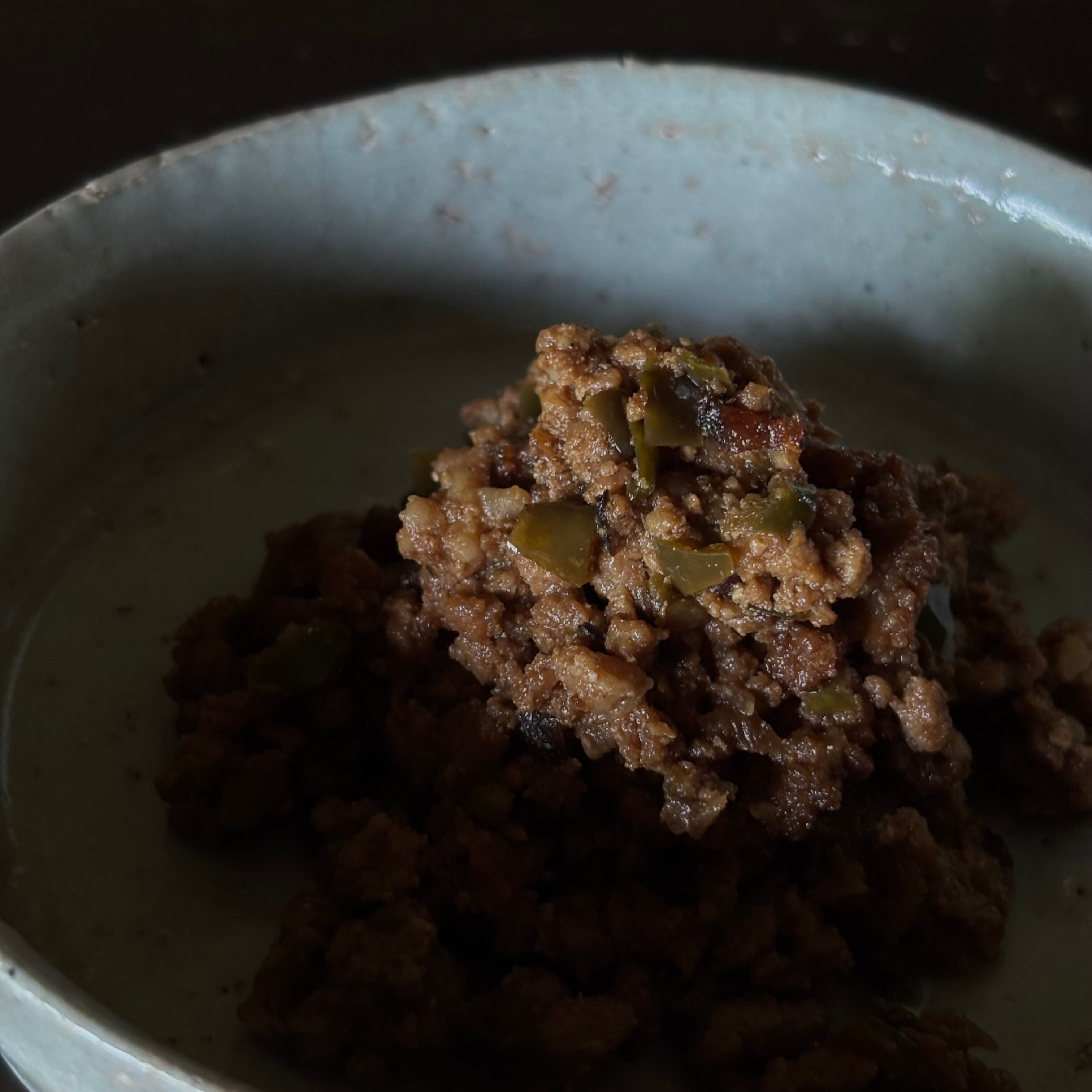 隣町飯山のみゆき豚と信濃町の伝統野菜ぼたごしょう(夏に採れる甘みのあるトウガラシ)を自家製信州味噌と八丁味噌で煎り、春に山で摘んだ青山椒を効かせたピリ辛の肉そぼろ。